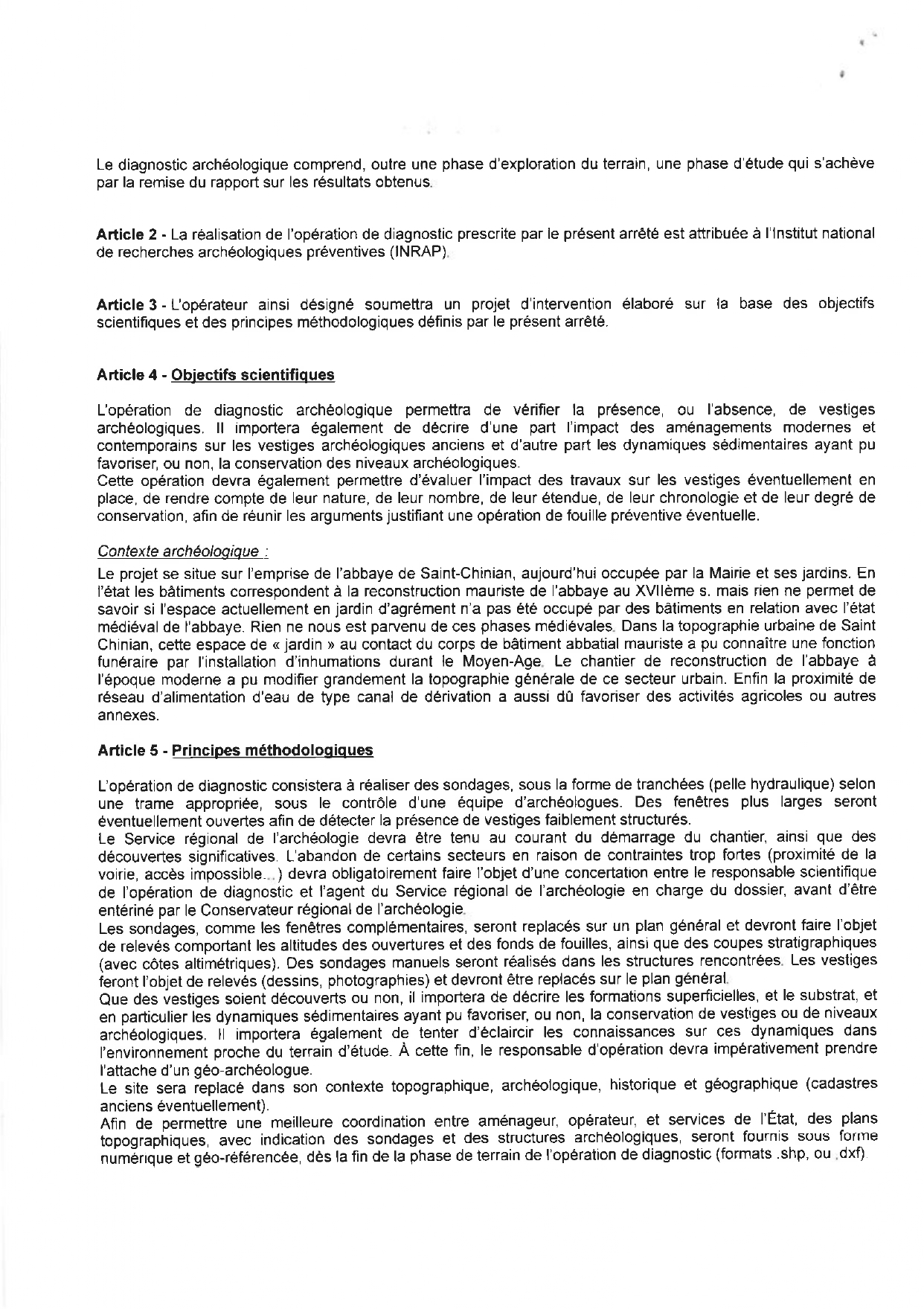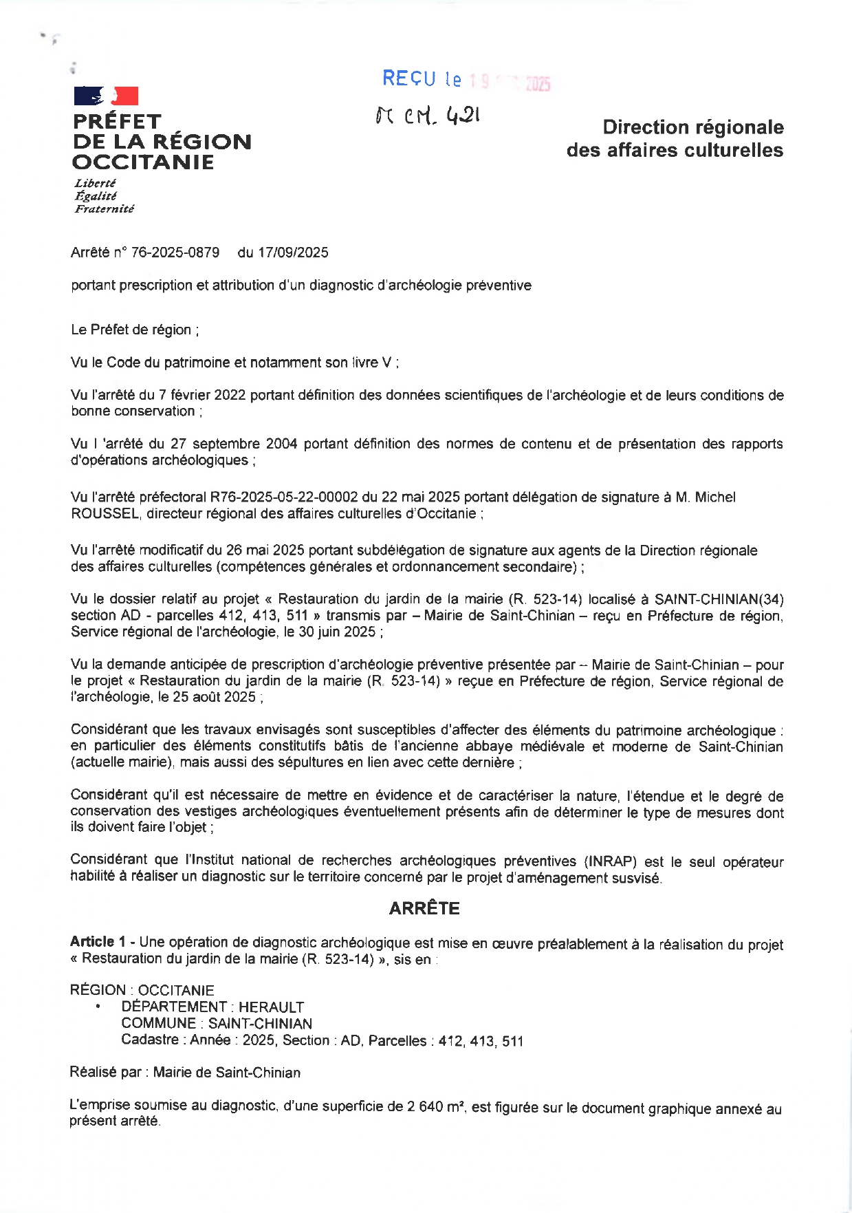 ARRETE portant prescription et attribution d'un diagnostic d'archéologie préventive. Projet : restauration du Jardin de la Mairie